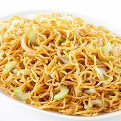 Stir-fried wheat noodles with onions, celery and cabbage.